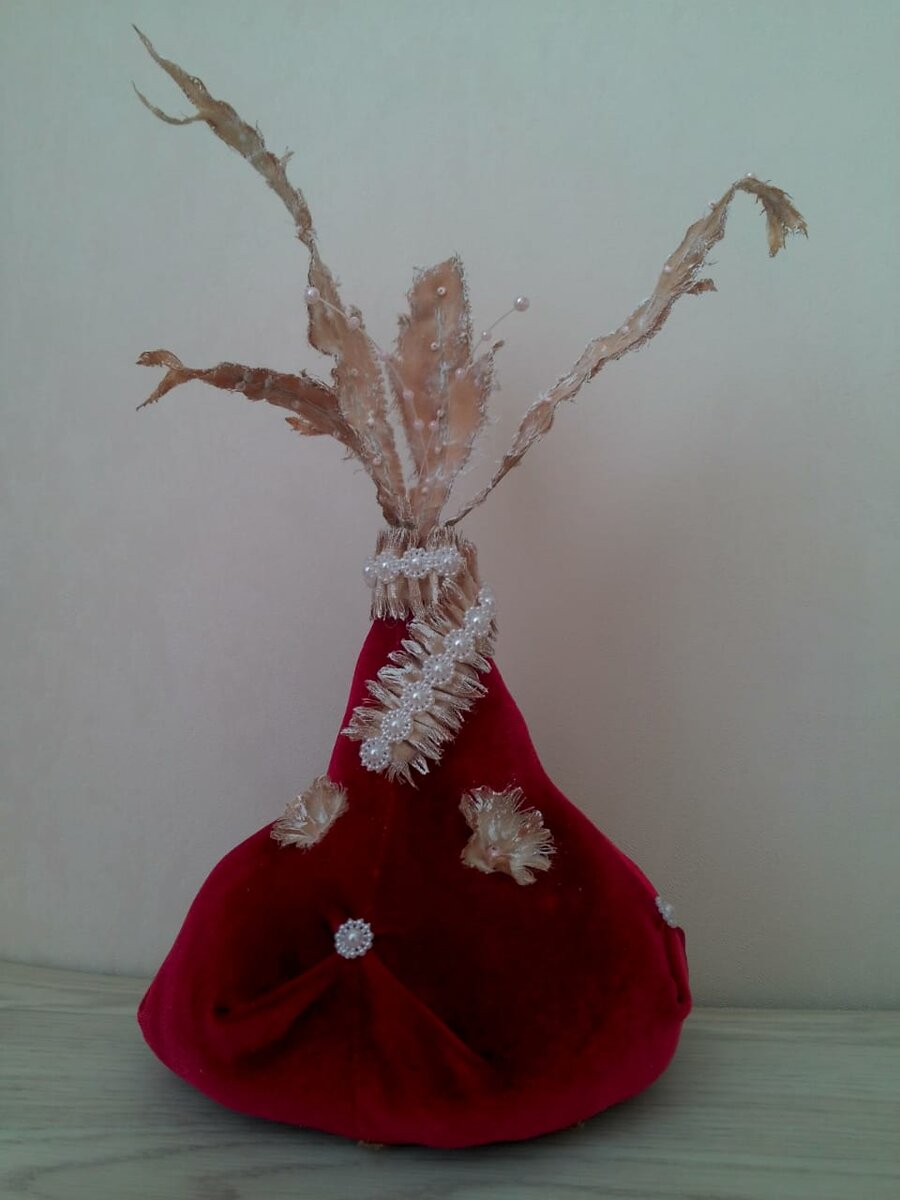 Шьём игольницу по форме получится луковица. Нужна ткань, синтепон, бусины, проволока, акриловая краска. Делаем выкройку из ткани, сшиваем, наполняем синтепоном. Уголки пришиваем на бусинки. Вырезаем кружки, дно, перья и полоску ткани ширина 3см длинна 40см. Полоску прошиваем по середине и делаем сборку. Края делаем лохматыми. 4 кружочка пришиваем на бусины длинной иглой через дно. Чтоб бусина была немного утоплена во внутрь. Дно тоже пришьём на бусину. В середину перьев вставляем проволоку и прошиваем. Можно добавить бисер. Синтетической кистью красим перья, дно, полоску, кружки в кофейном растворе. Кофе 1 чайная ложка, сахар 1 чайная ложка, вода 50 мл. Сушим. Поле высыхания собираем. Берём белую акриловую краску и полусухой кистью наносим напыление. Вначале я пришила красные бусины, но когда украсила пластмассовой тесьмой они оказались лишние, и я их заменила на цветочки. ссылка на выкройку http://gestyy.com/w9X212
