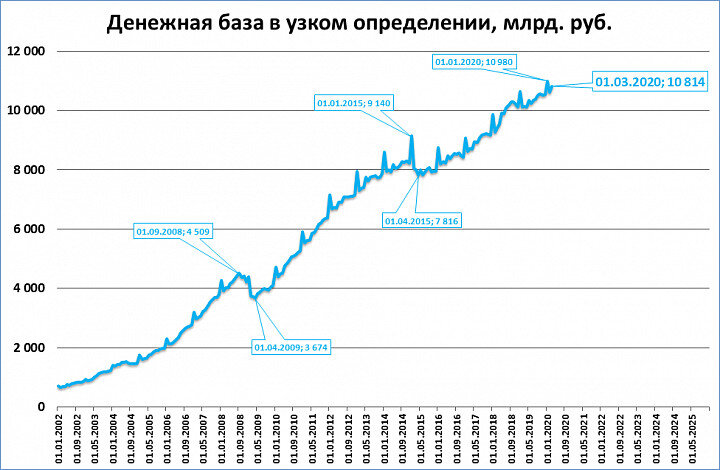 Узкая денежная база (далее – УДБ) на 1 марта составила 10,8 триллиона рублей. Это второй лучший результат в истории, уступающий лишь результату на 1 января 2020 года (10,98 трлн.) С июля 2018 года (более полутора лет) УДБ колеблется в диапазоне 10-11 трлн. рублей. Нас интересуют реальные величины, учитывающие инфляцию. В реальном выражении УДБ пока далека от исторического рекорда 2014 года. Четыре последних месяца реальная УДБ растёт, а два последних месяца – заметно растёт. В феврале мы продолжили отходить от «края пропасти», куда вёл нас ЦБ, сокращая денежную базу. Если бы мы в эту пропасть свалились (см. красные столбцы на графике в 2008, 2014, 2019 годах) могли последовать традиционные для кризисов в России события: девальвация рубля, сокращение ВВП и т.д. (на графике обозначены "вспышками"). Однако пока неясна реакция ЦБ на события на валютных и фондовых площадках конца февраля. Будем надеяться, что ЦБ не будет паниковать и повторять ошибки прошлых кризисов (механизм прошлых кри