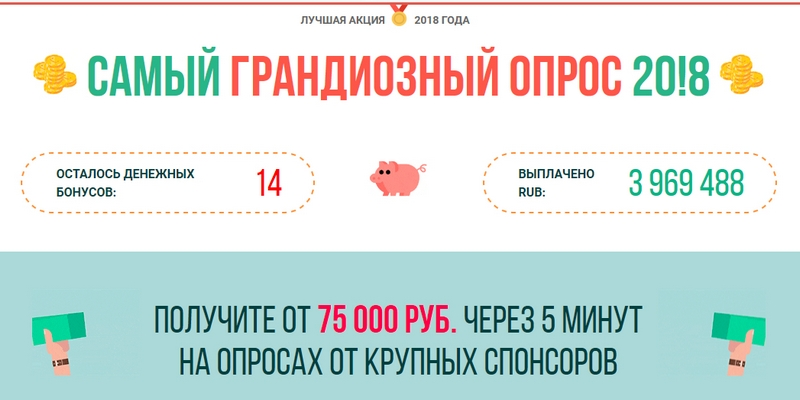 Все мы знаем способ заработка в интернете в которым мы проходим минут за 15-30 и получаем 20-30 рублей. И многие и правда делают на этом методе суммы которых хватает на интернет и ЖКХ. Но мошенники уловили это и начали создавать мошеннические проекты по типу "Самый грандиозный опрос, золотой опрос" и прочие. На этом На этом сайте вам предлагают пройти несколько опросов и получить от 75000 рублей за один опрос. Но на вопросы по типу "А зачем сайту платить нам такие деньги?" Сайт отвечает: якобы самые великие и богатые бренды платят нам за то, что мы предоставляем эти опросы. Если честно, то один раз мне прислал такой сайт мне мой друг. Но на том сайте создателем и в тоже время спонсором был WhatsApp. В то время я чуть не оплатил комиссию на сайте в размере 249 рублей. Это было бы смешно, ведь в то время мне было всего 12 лет. Чтож на сайте мы видим красивое оформление и увидев бы этот сайт я бы подумал , что это вовсе не лохотрон и возможно но бы заинтересовался. На сайте мы прохо