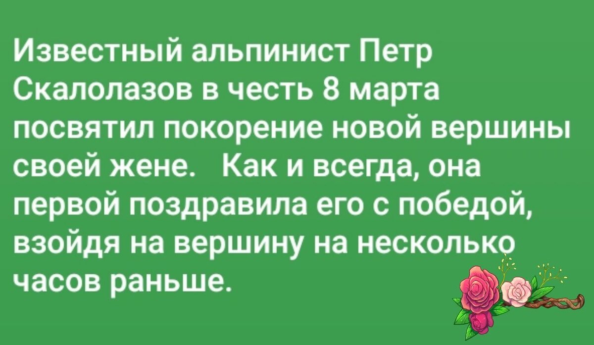 Поздравляем всех женщин с международным женским днем. 🌹🌹🌹 *** - Любимая! Какой подарок хочешь на 8 марта? Что тебе подарить? - Нууу, я даже не знаю... - Тогда у тебя ещё один год на размышления. 😂 *** - Димон, скоро ведь восьмое марта! Я так рад, что мы отметим его вместе! - Блин, Василич, что-то мне расхотелось дежурить с тобой в одну смену... Спасибо, за то, что читаете. 😋 Поддержите лайком 👍🏻