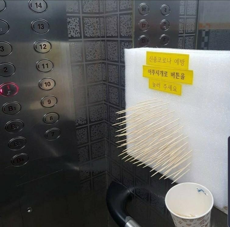 Пара, замеченная в Шанхае Знак в лифте в Южной Корее, на котором написано: «Используйте зубочистки, чтобы нажимать кнопки»