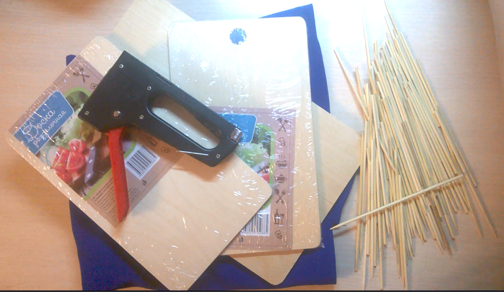 Вырезаем ткань нужного размера. Степплером с левой стороны закрепляем так , чтобы с лицевой стороны поверхность была гладкой , не морщилась.