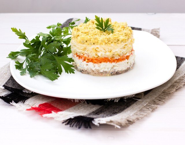 Для салата понадобиться: Приготовление: 🍽🍽🍽 Отвариваем яйца, картофель и морковь для салата. Оставляем остывать. • Открываем рыбную консерву и размельчаем на мелкие кусочки. • Натираем картофель, морковь и сыр. Яйца нужно разделить на белок и желток. Белок нарезать мелкими кубиками. Отдельно натереть желток. ШАГ 3 ✍️ Подбираем миску, салат готовиться слоями. Каждый слой промазываем майонезом! 1 слой - консервы рыбные 2 слой - картофель 3 слой - морковь 4 слой - белки яиц 5 слой- сыр На последний слой выкладываем натёртый желток и украшаем зеленью ! 🥬🥬🥬