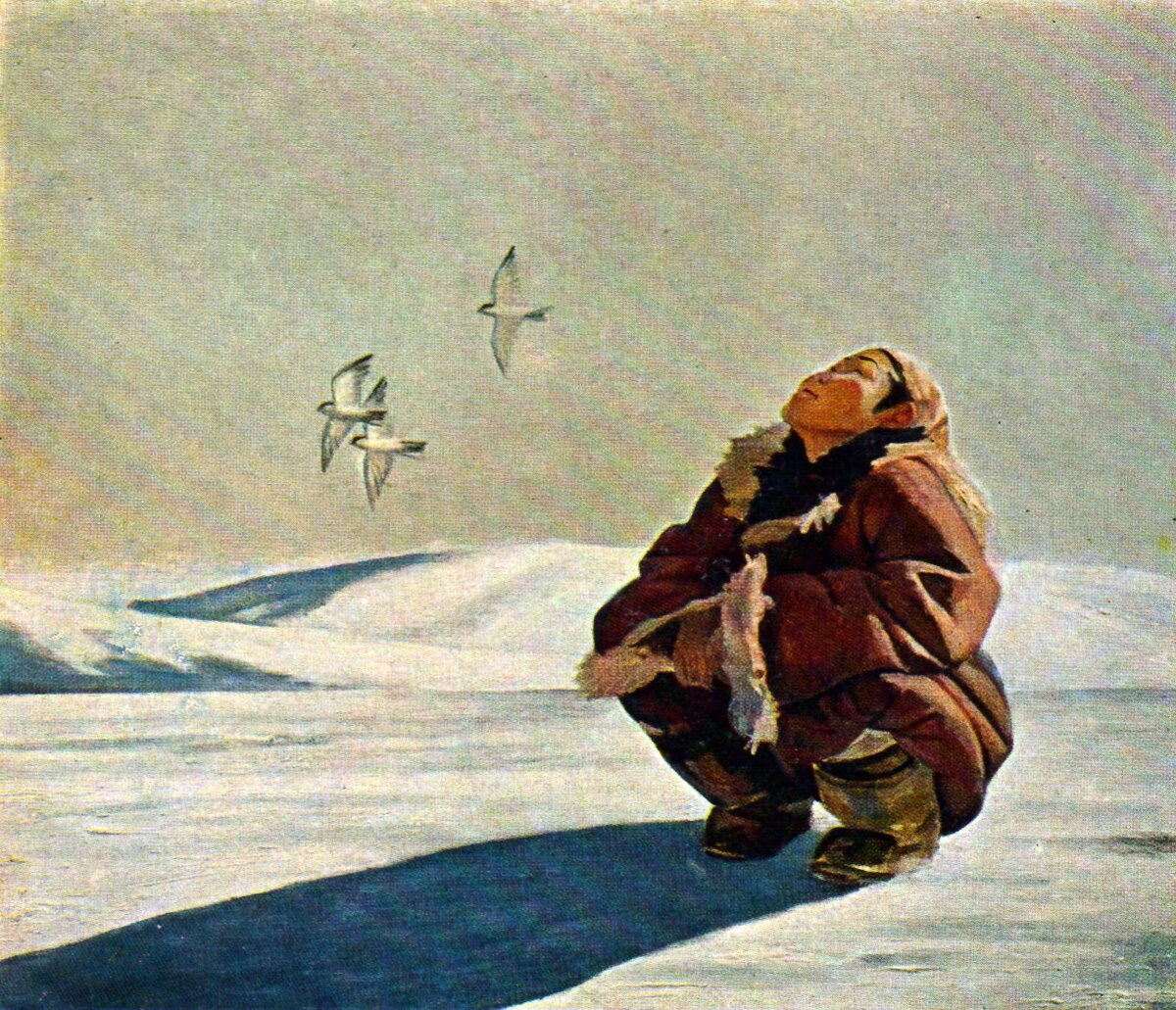 Но в том и достоинство романа, что Рытхэу все время пытается уйти с накатанной сюжетной дороги. Раненного Джона отправляют в Анадырь. Однако ожидаемого пробега по живописной тундре с портретами туземцев ты не получаешь. Купили вельботы. Сейчас заживем – но не судьба. Джрн начал писать письмо в Лигу Наций – и это тоже кончилось никак. Прямо как в жизни, где все имеет начало, но не всегда получает логичное завершение, как это принято в литературе.
