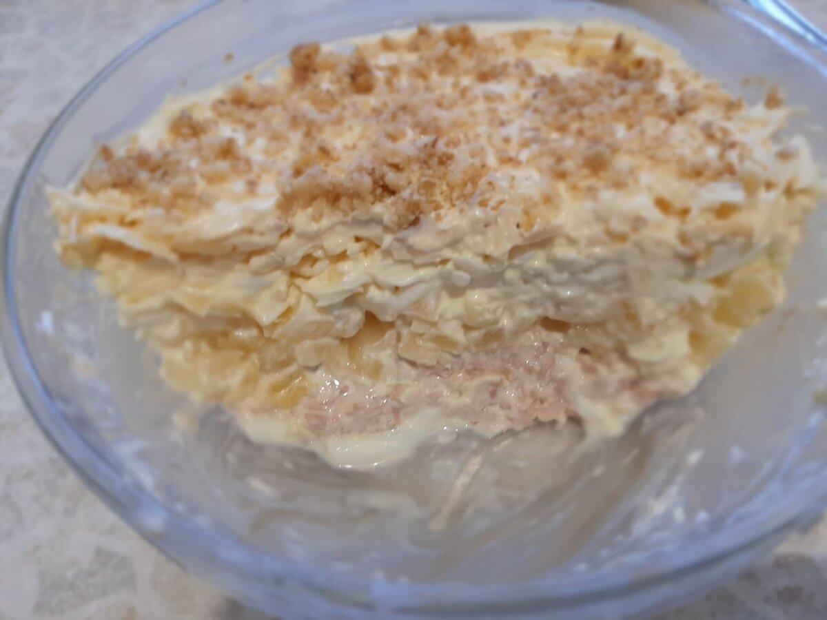 ΠΡΠΎ ΡΠ°ΠΌΡΠΉ ΠΏΡΠΎΡΡΠΎΠΉ ΠΈ Π²ΠΊΡΡΠ½ΡΠΉ ΡΠ°Π»Π°Ρ, ΠΊΠΎΡΠΎΡΡΠΉ Π½ΡΠ°Π²ΠΈΡΡΡ ΠΈ Π²Π·ΡΠΎΡΠ»ΡΠΌ ΠΈ Π΄Π΅ΡΡΠΌ, ΠΏΠΎΡΠΎΠΌΡ ΡΡΠΎ ΠΎΠ½ Π½Π΅ΠΆΠ½ΡΠΉ ΠΈ ΡΠ»Π°Π΄ΠΊΠΈΠΉ!!! Π Π²ΠΎΡ ΡΡΠΈ ΠΏΡΠΎΠ΄ΡΠΊΡΡ Π½Π°ΠΌ ΠΏΡΠΈΠ³ΠΎΠ΄ΡΡΡΡ Π΄Π»Ρ ΠΏΡΠΈΠ³ΠΎΡΠΎΠ²Π»Π΅Π½ΠΈΡ ΡΠ°Π»Π°ΡΠ°: Π’Π΅ΠΏΠ΅ΡΡ Π² ΡΠ°Π»Π°ΡΠ½ΠΈΡΡ Π½Π°ΡΠΈΠ½Π°Π΅ΠΌ Π²ΡΠΊΠ»Π°Π΄ΡΠ²Π°ΡΡ ΡΠ»Π΅Π΄ΡΡΡΠΈΠ΅ ΡΠ»ΠΎΠΈ: 1 ΡΠ»ΠΎΠΉ- ΠΌΠ΅Π»ΠΊΠΎ ΠΏΠΎΡΠ΅Π·Π°Π½Π½ΠΎΠ΅ ΠΊΡΡΠΈΠ½ΠΎΠ΅ ΠΌΡΡΠΎ (Ρ ΠΌΠ΅Π½Ρ ΠΊΡΡΠΈΠ½ΠΎΠ΅ Π±Π΅Π΄ΡΡΡΠΊΠΎ) ΡΠ°Π²Π½ΠΎΠΌΠ΅ΡΠ½ΠΎ ΡΠ°ΡΠΏΡΠ΅Π΄Π΅Π»ΡΠ΅ΠΌ ΠΏΠΎ Π΄Π½Ρ ΡΠ°Π»Π°ΡΠ½ΠΈΡΡ ΠΠ΅ΠΆΠ΄Ρ ΡΠ»ΠΎΡΠΌΠΈ Π½Π΅ Π·Π°Π±ΡΠ²Π°Π΅ΠΌ ΡΠΌΠ°Π·ΡΠ²Π°ΡΡ ΠΌΠ°ΠΉΠΎΠ½Π΅Π·ΠΎΠΌ 2 ΡΠ»ΠΎΠΉ- Π°Π½Π°Π½Π°ΡΡ ΠΌΠ΅Π»ΠΊΠΎ ΠΏΠΎΡΠ΅Π·Π°Π½Π½ΡΠ΅ ΠΠΏΡΡΡ ΠΆΠ΅ ΡΠΌΠ°Π·ΡΠ²Π°Π΅ΠΌ ΠΌΠ°ΠΉΠΎΠ½Π΅Π·ΠΎΠΌ 3 ΡΠ»ΠΎΠΉ- ΡΠΉΡΠΎ Π½Π°ΡΠ΅ΡΡΠΎΠ΅ Π½Π° ΡΠ΅ΡΠΊΠ΅ Π ΡΠ½ΠΎΠ²Π° ΠΌΠ°ΠΉΠΎΠ½Π΅Π·ΠΎΠΌ ΡΠΌΠ°Π·ΡΠ²Π°Π΅ΠΌ 4 ΡΠ»ΠΎΠΉ- ΡΡΡ ΠΆΠ΅Π»Π°ΡΠ΅Π»ΡΠ½ΠΎ ΡΠ²ΡΡΠ΄ΡΡ