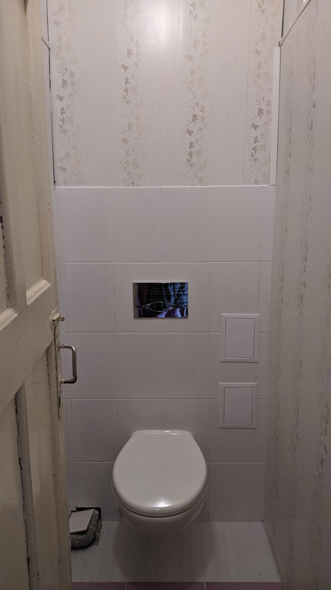 Здравствуйте, дорогие друзья! Рассказываю о ремонте туалетной комнаты в своей квартире, которую купила относительно недавно. Квартира-бывшая коммуналка, в самом ужасном состоянии находятся места общего пользования. И пальма первенства по самому жуткому состоянию принадлежала именно этому помещению. Вот как оно выглядело. Полностью отодрав обои я обнаружила такую дыру! Я решила обшить стены ПВХ -панелями, пол выложить остатками плитки, которая осталась после предыдущего ремонта.Поставить инсталляцию и покрасить потолок. Вот часть чеков за стройматериалы, унитаз с инсталляцией обошелся в 15 тысяч рублей.За работу мастеру отдала 15 тысяч рублей.Полностью все (материалы и работа) обошлось в районе 40 тысяч рублей. Не могу сказать , что работы выполнены на 100% , так как нужно, что то придумать с дверью. Так как она не стандартных размеров и менять ее на новую очень накладно. Хочу попробовать отреставрировать ее. Так как она выполнена из натурального дерева и находится в неплохом состояни