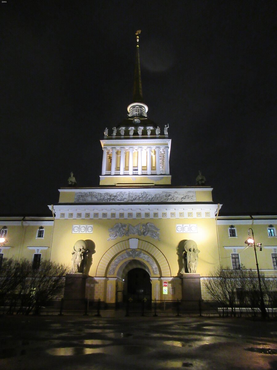 Сегодня новая фотоистория, у меня осталось немного фотографий. Они сделаны в начале марта 2020 года, когда я была в командировке в Санкт-Петербурге. Мне посчастливилось побывать в Северной Столице незадолго до необходимости самоизоляции. Решила рассказать о здании Адмиралтейства, оно очень красивое. Здание жёлтого цвета, его невозможно не заметить. Видно его с Невского проспекта, Дворцовой набережной и Васильевского острова. Вдоль здания расположен Александровский сад. Сейчас на деревьях нет листвы, поэтому здание хорошо видно. Летом его закрывают деревья. На фасаде барельефы, скульптуры и колонны. Сможете найти морского царя с трезубцем? Наверху расположены часы и скульптуры: Внизу женские фигуры, в руках у них огромный шар. Не знаю что он символизирует, возможно планету. По углам размещены вот такие скульптуры: Знакомый кораблик? Помню его по советским фильмам, а точнее заставке Ленфильма. Здание очень большое, имеет два фасада. Вдоль Адмиралтейства расположена Адмиралтейская набере