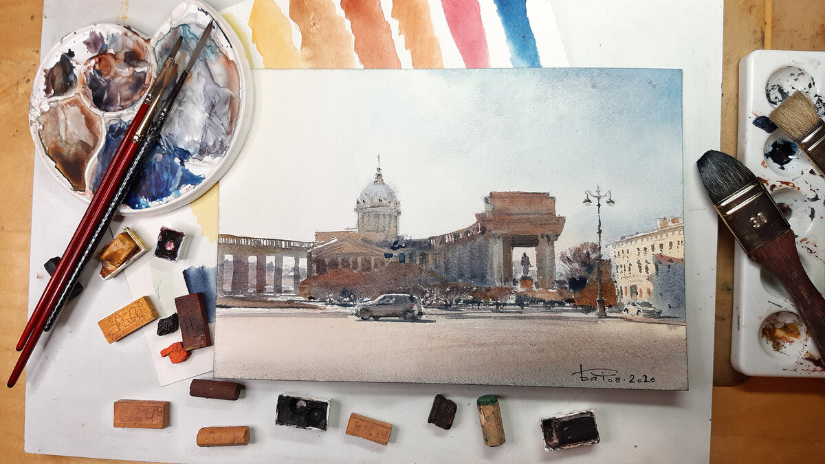 В детстве мне подарили россыпью старинные акварельные краски. Часть из них были украшены сложными рельефами и надписями, прочесть удалось: Rowney (London), P.C.Lambertye (J.M.Paillard). Шестигранные призмы скорее всего Winsor&Newton. Думаю, краски были изготовлены до 1917 года. Для работы над пейзажем я выбрал: Прусскую синяюю, Охру, Сиену жжёную (Железоокисную), Ализарин малиновый, Серую Пейна, Кадмий жёлтый (предположительно). Киноварь и Зелёная земля окаменели и размочить их мне не удалось. Контражурный сюжет Невского проспекта с видом на Казанский собор. Видео тестирования красок и живописного процесса