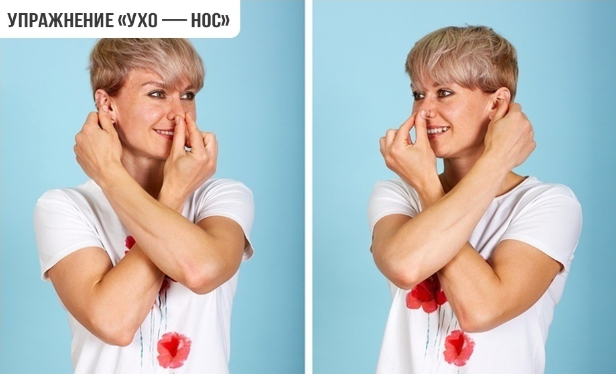 1. Упражнение "Ухо - Нос" На первый взгляд данное упражнение кажется лёгким. Всего лишь нужно пальцами левой руки дотронуться до своего носа, а правой рукой взять себя за левое ухо, а затем хлопнуть в ладоши и поменять руки: Правая - на нос, а левая - на ухо. Каким бы простым оно не выглядело изначально, но с ним редко кто справляется с первой попытки. Зато при частых регулярных тренировках результат не заставит себя ждать, а два ваших полушария скажут спасибо за поддержку в координации их работы. 2. Упражнение "Энергетизатор" Превосходное упражнения для расслабления мышц плеч и шеи, замученных сидячим днём. Необходимо положить руки на стол и неспешно опускать вниз подбородок, пока он не коснётся вашей груди. Находитесь в данном положение пару секунд, а после с глубоким вдохом поднимите голову, расправив плечи, максимально раскрывая клетку груди. Руки всё также остаются на столе, выдыхая расслабьтесь и повторите процедуру пару раз. Данный тренинг способствует притоку кислорода в клетки