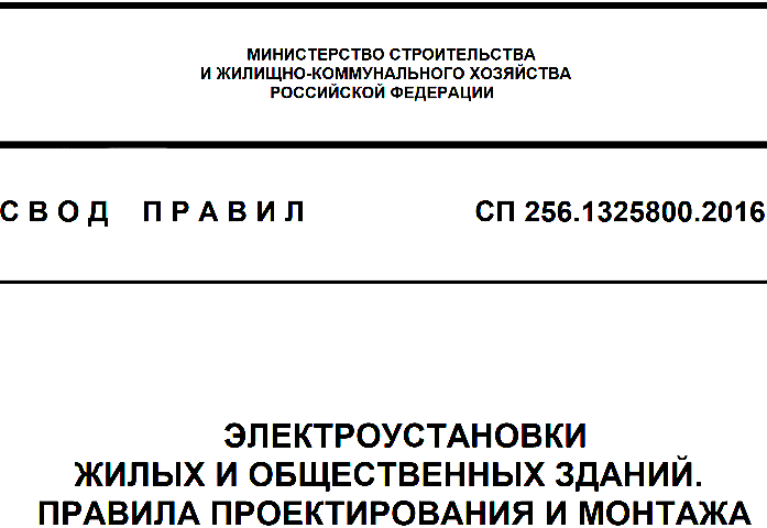 Свод правил СП 256.1325800.2016 «Электроустановки жилых и общественных зданий. Правила проектирования и монтажа» (далее − СП 256) действует со 2 марта 2017 г. СП 256 разработан на основе свода правил СП 31-110–2003 «Свод правил по проектированию и строительству. Проектирование и монтаж электроустановок жилых и общественных зданий» (далее − СП 31-110), который был введён в действие с1 января 2004 г.