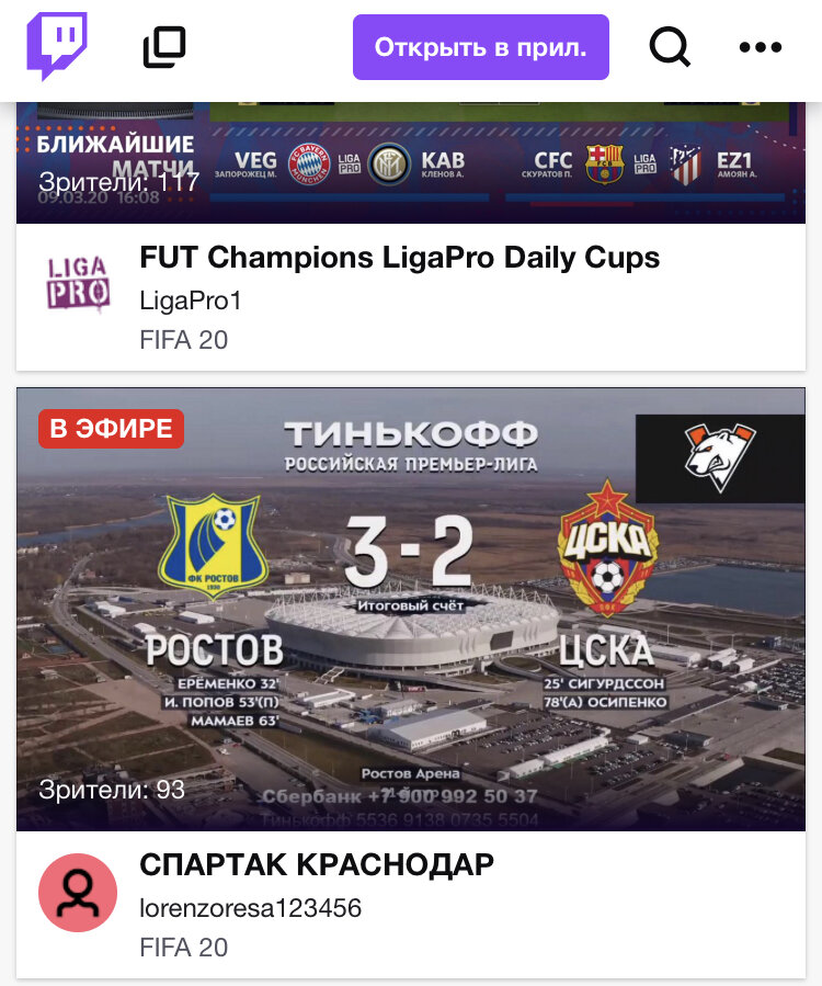 Сегодня рассмотрим несколько вариантов просмотра Российской футбольной премьер лиги. Все началось с того что в момента создания канала Матч-Тв большенство топовых матчей было на бесплатном федеральном канале. Но "Тина и компания" решила плюнуть на большую часть любителей футбола. Теперь почти все игры выходят на платном канале Матч-Премьер. Федеральный канал показывает всего 1 матч из 8 возможных. И вывеска там по типу Сочи-Урал. Все важные и топовые матчи на платном канале. Конечно же канал активно борется с пиратством контента. Но есть парочку реально рабочих вариантов. 1)Твич Платформа показывает как различные люди играют в различные игры. Но здесь очень часто идут трансляции. Алгоритм поиска трансляции таков: Это будет выглядеть примерно так. Иногда эти трансляции блокируют, но есть и другие трансляции. Просто ищите новую и смотрите дальше. 2) Ютуб Ютуб самый знаменитый видеохостинг. Прямые трансляции матчей здесь тоже есть. Для иностранных жителей все матчи РПЛ есть на Ютубе и вс