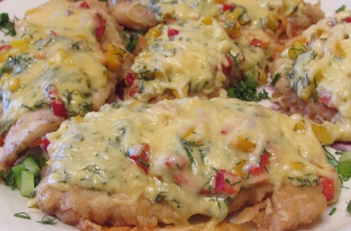 Филе куриное - 600 гр. соль - 1 ч. л. перец черный - 1 ч. л. паприка - 1 ч. л. сушеные травы - 1 ч. л. лук - 1 шт. помидор - 100 гр. зелень - 50 гр. яйца вареные - 3 шт. сыр - 50 гр. + 100 гр. для присыпки сверху чеснок - 2 зуб. майонез - 2 ст. л. растительное масло - 1 ст. л. Филе нарезаем пластинами. Отбиваем каждый кусочек. Переворачиваем и отбиваем с другой стороны. Посыпаем солью, перцем, паприкой, сушеными травами. Смазываем хорошо каждый кусочек с двух сторон. Оставляем на 15 минут. Делаем начинку. Лук нарезаем полукольцами. Отправляем в миску. Помидор режем кубиками. Добавляем к луку. Нарезаем зелень. Яйца отвариваем. Натираем на терке. Натираем сыр. Чеснок пропускаем через пресс. Добавляем майонез, соль, перец. Хорошо все перемешиваем. Противень смазываем маслом. Выкладываем наше филе. Сверху выкладываем, на каждый кусочек, нашу начинку. Посыпаем сыром. Разогреваем духовку до 200 градусов. Выпекаем 20 минут. Приятного аппетита!!! Подписывайтесь и не заб