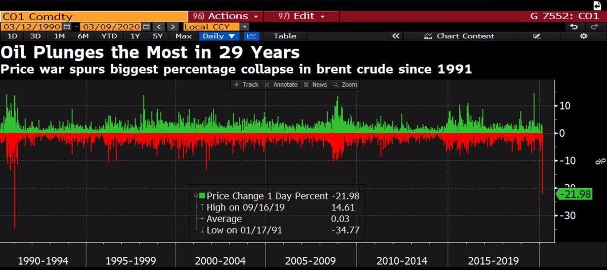 Цена на нефть рухнула на 30% до 31,5$ и продолжает пикировать. Это крупнейшее падение за 29 лет!