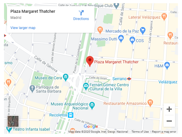 Рядом с Плаза Колон в Мадриде, в тени самого большого в мире испанского флага, находится Плаза Маргарет Тэтчер. В двух шагах от площади находится роскошный район Мадрида: Саламанка. Инаугурация площади состоялась в 2014 году. Ее открыла Ана Ботелла, в то время мэр Мадрида. На церемонии открытия Ботелла похвалила своего кумира как «пионера и вдохновительницу». Она также упомянула, что Тэтчер боролась за свободу людей внутри государства и что она была одной из величайших личностей 20-го века.