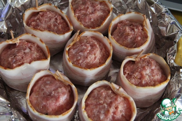 Продукты: Фарш — 600 гр Хлеб -1 кусочек Лук репчатый — 2 шт Молоко — 1 стакан Соль, перец — по вкусу Сыр твердый — 100 гр Бекон (полоски) — 200 гр Растительное масло — для жарки Чеснок и зелень - по желанию Рецепт приготовления Лук почистить и порезать мелкими кубиками. На сковороде с растительным маслом обжарить порезанный лук до золотистого цвета. В фарш добавить обжаренный лук, посолить, поперчить, по вкусу. По желанию в мясной фарш добавить измельченный чеснок и порубленную зелень. Хлеб поломать руками на маленькие кусочки и залить молоком. По желанию вместо молока можно использовать сливки. Сыр натереть на мелкой терке. Хлебный мякиш, отжать от молока и добавить в фарш вместе с сыром. Все тщательно перемешать. Влажными руками сформировать из мясного фарша шарики небольшого размера и обернуть в полоски бекона. Скрепить зубочистками. Уложить закуску на противень, застеленный фольгой. Отправить блюдо в разогретую духовку. Запекать мясную закуску при температуре 200 градусо