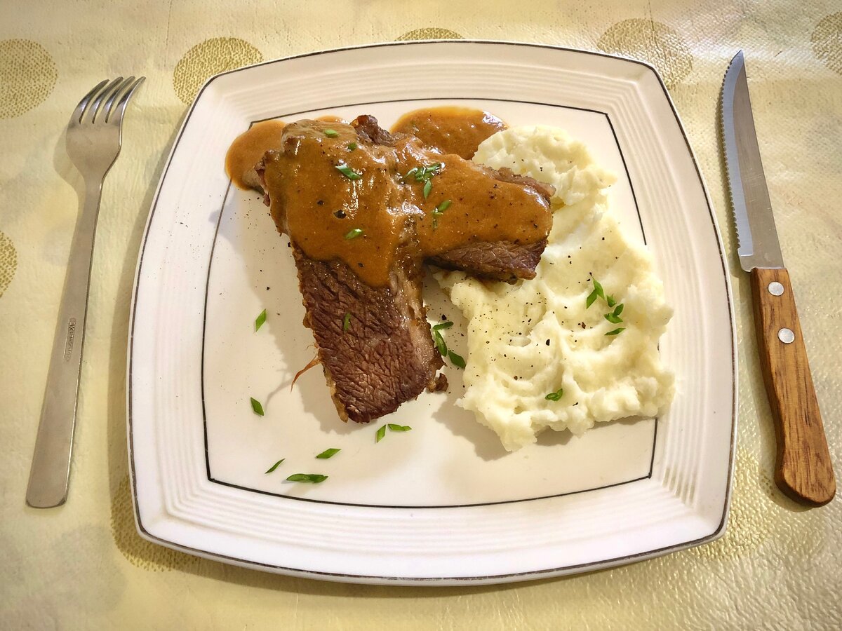 На этом, собственно, всё. Нарежьте острым ножом мясо поперек волокон, подайте с картофельным пюре (или овощным пюре, или любым вашим любимым гарниром), приправьте подливой и наслаждайтесь. Поверьте мне на слово, оно того стоит!