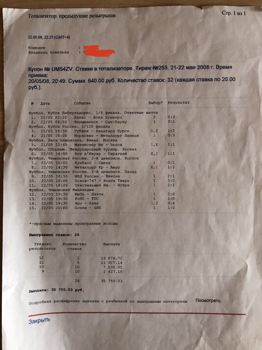 Тогда я отлично разбирался в футболе и играл на тотализаторе. В лохматом 2008 г. я угадал исходы в 12 матчах из 15. За победу во всех 15и я бы выиграл джек пот в размере 33 млн руб. Но тогда о таком я даже не думал, был студентом и мне по кайфу был и такой выигрыш. Проанализировал события , поставил на матчи. Где сомневался, перекрыл двойным исходом. За результатами не следил, ведь интернета тогда не было, да и как самой возможности. у меня тогда была Нокиа N95 и ставить теоретически можно было, как и следить за результатами, но водить Мышкой джойстиком было жесть конечно))) Утром погнал на треню, по возвращению увидел, что у меня 2 из 2ух. Кубок Либертодорос играет рано. Далее опять пару побед и 1 поражение. Тогда я отменил все дела, следил весь вечер за результатами, ведь тогда к меня не было такого хорошего старта ни разу. Но подвели меня именно Российские команды, в которых по своему убеждению я разбирался лучше, даже в командах 2го дивизиона. На удивление прошел весь чемпионат Фи