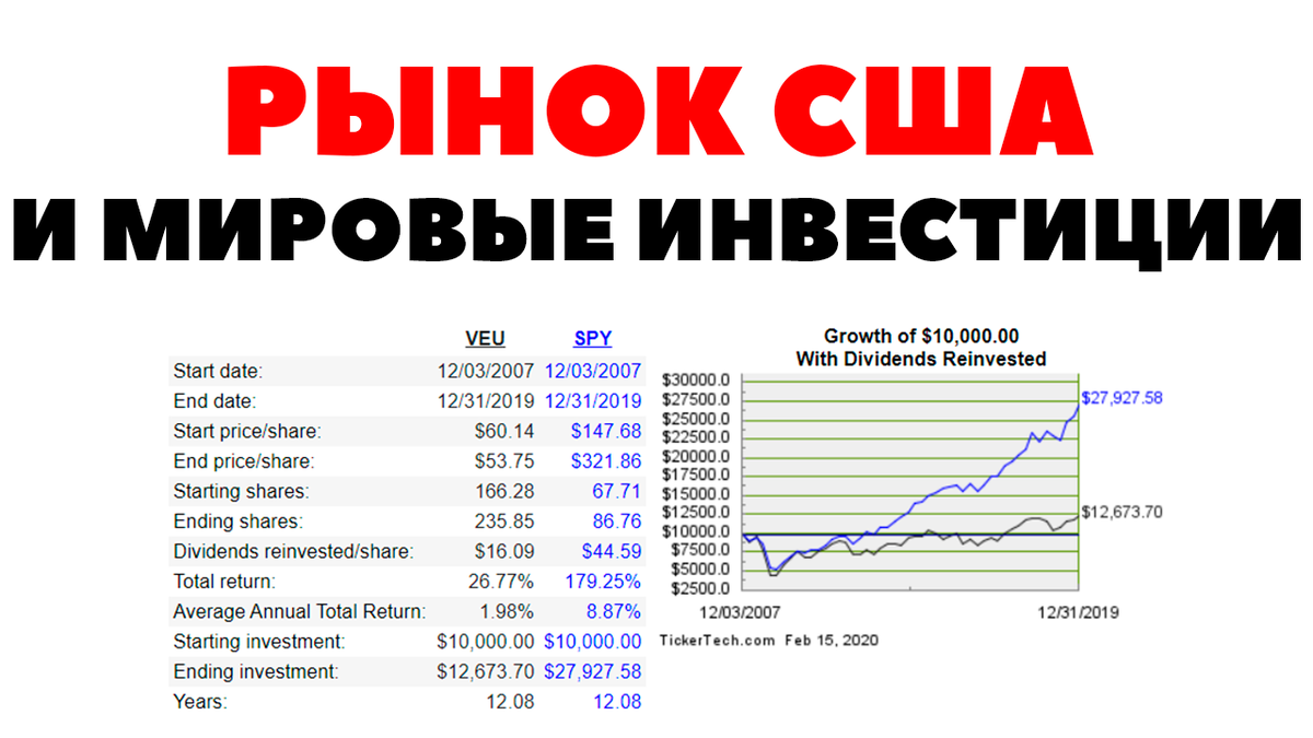 Дорогие друзья, вы знаете мою приверженность акциям США. И у меня есть целая рубрика посвященная преимуществам акций США - почему я рекомендую инвестировать деньги в эти активы. Давайте вновь поговорим на эту тему. И речь пойдет не о более развитом корпоративном праве, о невероятной защите инвесторов и страховке SIPC, не о доминировании США в сфере технологий и патентов. Речь пойдет о простой и легко измеряемой, но очень важной вещи для инвестора - доходности. Куда выгоднее инвестировать 10000$: в акции США или во весь остальной мир? И для оценки мы используем индексные ETF, как очень простой способ оценить общую динамику инвестиций. Предположим, вы решили вложить 10000$ в фондовый рынок, чтобы заработать. Если вы не хотите разрабатывать стратегию, покупать отдельные акции, и вас устраивает средняя доходность и средние дивиденды, то вполне можно ограничиться индексными фондами. Например, я буду использовать SPY на S&P500, как существующий более длительное время. Сравним инвестиции