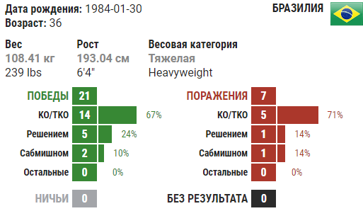 Кейн Веласкес (США, 11-1) Титулы и награды Борьба Ultimate Fighting Championship Награды Джуниор Дос Сантос (Бразилия, 15-2) Титулы и достижения Даниэль Кормье (США, 11-0) Титулы и достижения Смешанные единоборства Фабрицио Вердум (Бразилия, 16-5) Титулы и достижения Смешанные единоборства Антонио Силва (Бразилия, 18-4) Карьера в смешанных единоборствах Он участвовал в таких организациях как Hero's, BodogFight и Elite Xtreme Combat (где он был чемпионом в тяжёлом весе), а сейчас сражается за Strikeforce и Sengoku. Он имеет 18 побед и 7 поражений в своей карьере в смешанных боевых искусствах, поражение от рук Эрика Пеле, где многие посчитали, что бой был слишком рано остановлен, от Фабрицио Вердума со счетом 29-28 в пользу Вердума и поражение нокаутом от Даниэля Кормье. 12 февраля 2011 года Силва встретился в четвертьфинале «Strikeforce Grand Prix» с российским бойцом Фёдором Емельяненко и одержал над ним победу техническим нокаутом (у Емельян