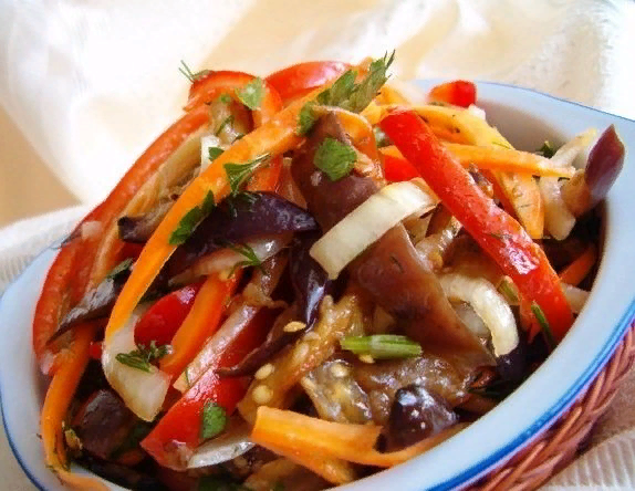 Понадобится: 3 больших помидора, 2 средних баклажана, 2 болгарских перца, 2 веточки базилика, горсть кедровых орехов, 2-3 столовые ложки оливкового масла, 2 веточки петрушки (или кинзы), 2-3 зубчика чеснока, 1 кофейная ложка сахара, 2 столовые ложки лимонного сока, соль и свежемолотый перец по вкусу. Перец, баклажаны и томаты помойте и обсушите. Выложите овощи на застеленный пергаментом противень. Баклажаны наколите зубочисткой или вилкой в 2-3 местах, на помидорах тоже сделайте несколько проколов. Запекайте овощи при 220-240° до мягкости. Помидоры с перцем приготовятся примерно за 20-25 минут (их нужно вынуть из духовки и накрыть пищевой пленкой). Баклажаны будут запекаться дольше – около 45 минут (они должны стать абсолютно мягкими). Готовые баклажаны тоже затяните пленкой и дайте им «отдохнуть» четверть часа. Затем снимите с овощей кожицу, нарежьте ломтиками и выложите в салатницу. Чеснок мелко порубите. Вымытую и обсушенную зелень измельчите и соедините с овощами. В другой миске