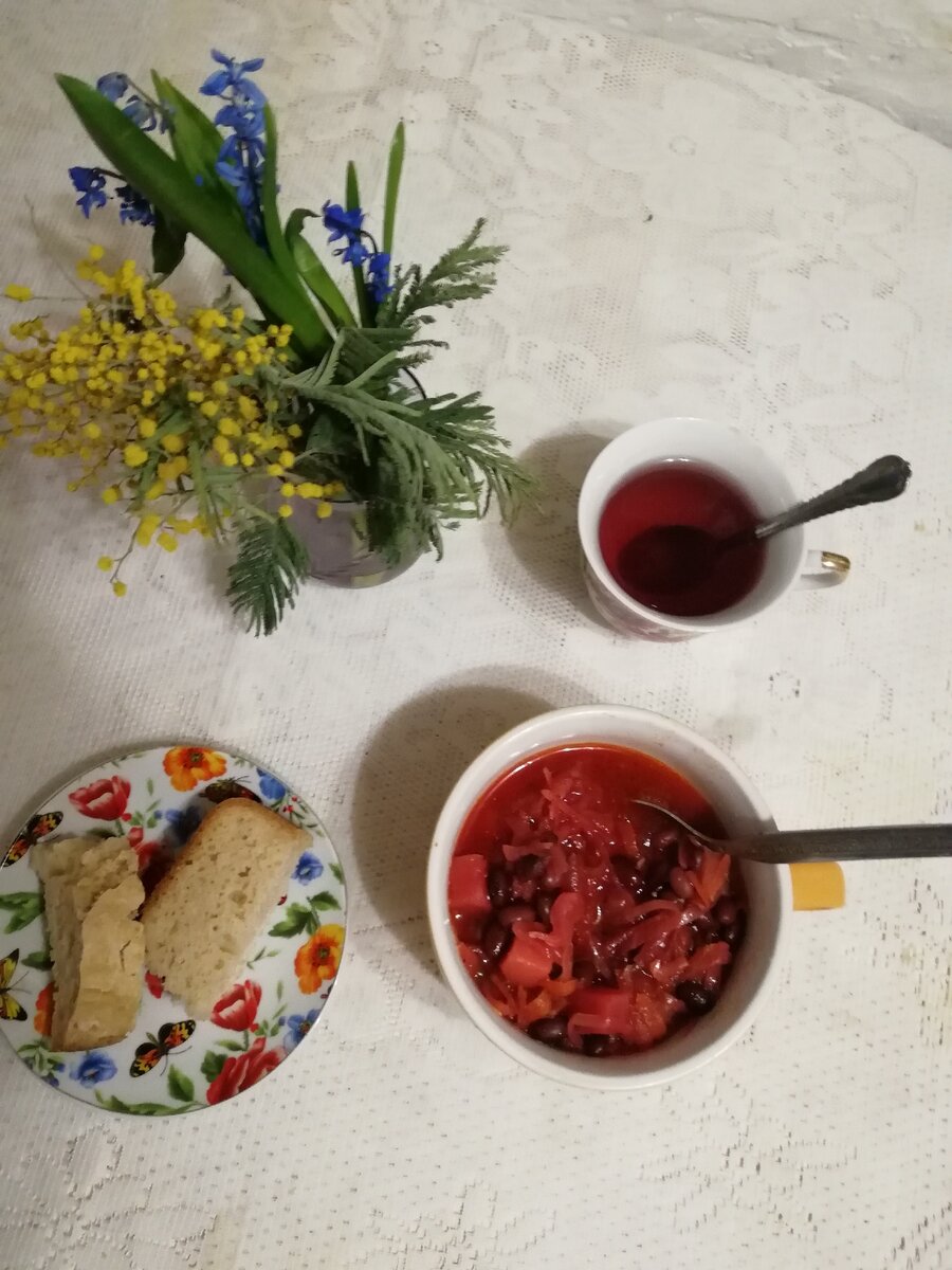 В продолжение поста, готовлю постный борщ. Без подобно вкусно и сытно ! 🍲 Не зависимо от того, пост ли сейчас или нет, все мы знаем, что первые блюда обязательно должны быть в рационе человека. А также наш организм должен получать белковую пищу. Бобовые очень хорошо восполняют не хватающие нам элементы. Для приготовления нам нужно : Фасоль 150гр., Свекла 1 шт., Картофель 4-6 шт., Капуста 300 гр., Морковь 1-2 шт., Лук 1-2 шт., Томат 1 ст., Растит.масла 100 - 150 гр. Я в первую очередь, ставлю варится фасоль, предварительно хорошо её промываю и замачиваю на 3 - 4 часа. Пока фасоль варится, а варить её надо минут 30 - 40, делаю зажарку обычным способом. Обжариваю лук, спустя минут 10 выкладываю измельчённые морковь, свёклу, можно добавить пару зубчиков чеснока и в конце выливаю томат. Зажарка естественно готовится на растит.масле. Когда фасоль поварится, как я уже говорила, минут 30 - 40, я закладываю картофель и через 10 мин. капусту. В конце приготовления, запраляю