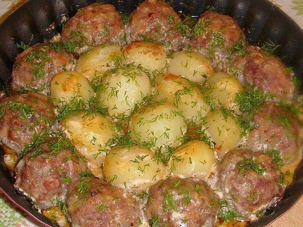 1. Котлетки с картошкой в сметано-томатном соусе Ингредиенты: ● Фарш-400 гр. ● Лук, чеснок, ● Яйцо, ● Булка(замочить в холодном молоке). ● Мука-2 ст. л.(для панировки). Приготовление: Приготовить фарш(как на котлетки),разделить, каждый шарик запанировать в муке. Уложить в смазанную форму, а середину картофель. Запекать в разогретой духовке 15 минут, при 220*. Для соуса смешать 2 ст. л. сметаны 1 ст. л. кетчупа 0.5 стакана воды, соль, перец. Залить соусом и оставить в духовку на 20 минут. При подаче посыпать зеленью! 2. Мясные рулетики с картошкой в сливках Ингредиенты: ● Мясо-500 гр. ● Яйцо-2 шт. ● Сливки 33%-3 стол.л.+200 гр.(для заливки) ● Зелень ● Чеснок-2 зубчика Приготовление: 1.Взбить 2 яйца+ сливки+ зелень+ щепотка соли. На смазанной и разогретой сковороде испечь омлет. Остудить его, смазать немного майонезом, свернуть трубочкой и нарезать на небольшие кусочки. 2.Мясо нарезать порцион. кусочками, отбить, смазать смесью(соль, перец, чеснок).На каждый кусочек мяса уложить по к