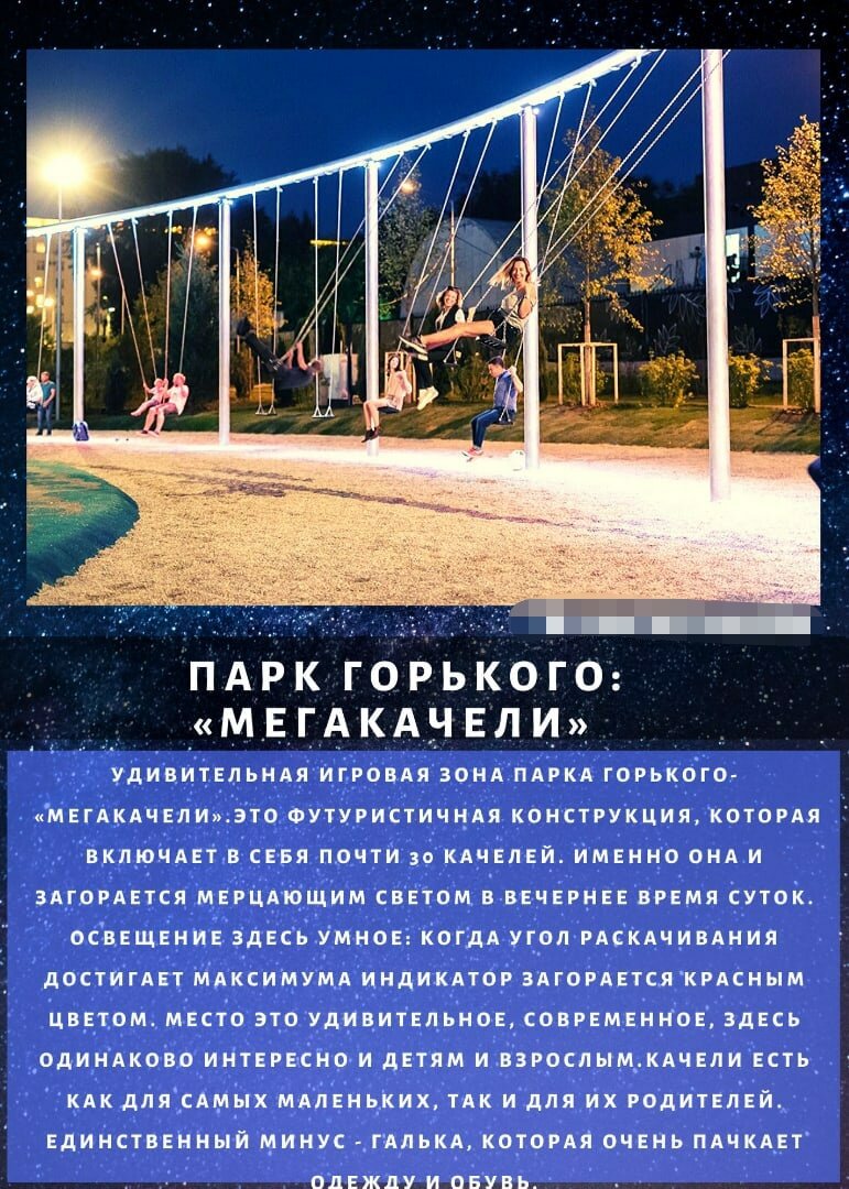 Ночью красота парков своеобразна, к тому же замечательно украшена иллюминацией! Подборка парков, которые не оставят вас равнодушными ни днём, ни ночью: 1. Парк Горького 2. "Парк света" 3. Воробьёвы горы 4. Измайловский парк 5. Царицыно 6. Сокольники 7. Зарядье подптшись и будь в курсе!