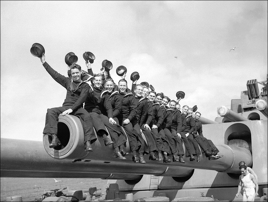 Довольно распространённый сюжет, но что кроется за этими снимками? Давайте заглянем поглубже. Это снимок британских моряков линкора "Нельсон". Корабль был несколько необычен. Как и у его брата "Родни" (а по-английски - сестры), в отличие от других линейных кораблей все три башни главного калибра были расположены в носовой части: