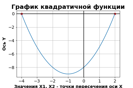 Программа на Python, в оболочке Tkinker, для запуска необходим Питон, установленный в системе с библиотеками, которые приведены в начале программы. На входе окно для ввода трех значений (a,b,c). На выходе определяет корни квадратного уравнения, а также отображает дискриминант, после чегот закрываем окно калькулятора и строится график на основании исходных данных, введенных пользователем. Квадратное уравнение, как известно, в случает положительного дискриминанта получает корни (решения), которые по сути являются точками пересечения с осью Х, что и реализуется в данном коде. Оригинал с кодом здесь
