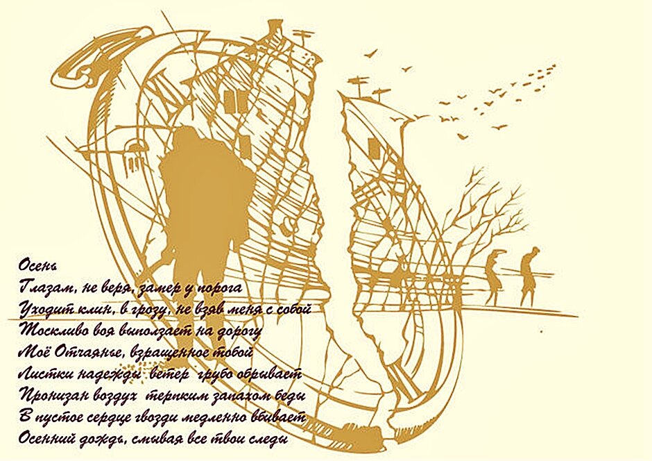 Осень Глазам не веря, замер на пороге Уходит клин, в грозу, не взяв меня с собой Тоскливо проползает по дороге Отчаянье, взращенное тобой Листки надежды ветер обрывает Пронизан воздух запахом беды И гвозди в душу медленно вбивает Осенний дождь, смывая все следы... © Александр Мишарев, 2010