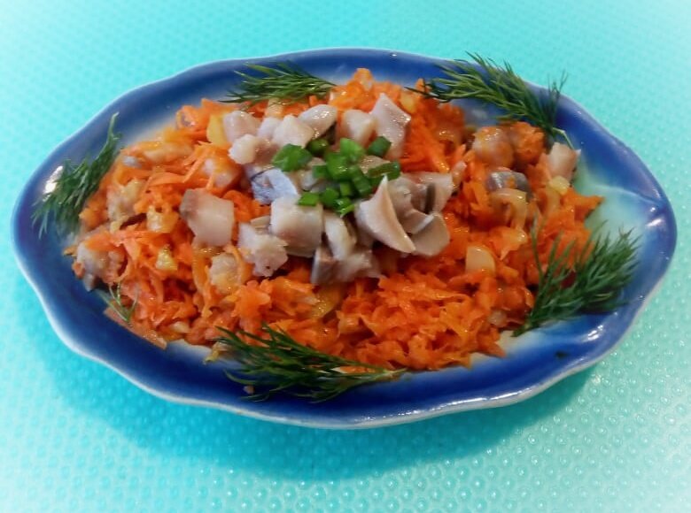 Легкая во всех отношениях закуска, которая отлично подойдет для праздничного стола и для домашнего обеда. Готовить это простое и вкусное блюдо одно удовольствие. Попробуйте хозяюшки, и вы не пожалеете. ПОНАДОБЯТСЯ ПРОДУКТЫ: ПРИГОТОВЛЕНИЕ: Получается очень вкусное и сытное блюдо. Попробуйте и вы точно не разочаруетесь. Это не селедка под шубой, которую нужно выкладывать слоями, это не менее вкусное блюдо, а готовить совершенно не сложно. Полезный совет от"Вкусняхи": Морковь быстрее сварится и сохранит свой цвет, если при варке положить в воду щепотку пищевой соды или лимонной кислоты. ПРИЯТНОГО АППЕТИТА!!!
