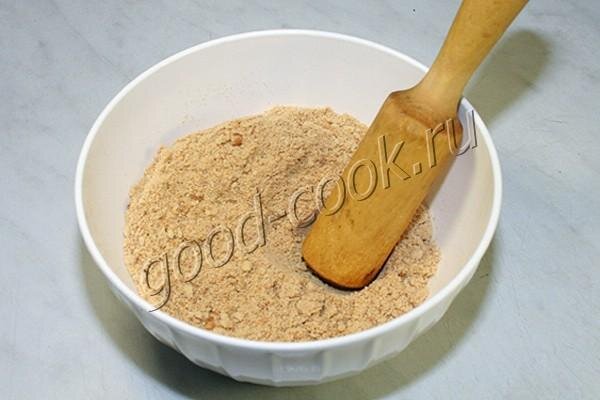 Печенье измельчить в крошку. Влить растопленное масло, размешать.