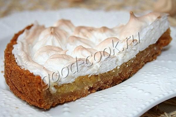 Красивый и вкусный пирог. Он состоит из трёх слоёв, имеющих разные текстуры и вкусы. Внизу находится хрустящий сладкий слой печенья. В середине - мягкая, пластичная кисловато-сладкая начинка с сильным цитрусовым ароматом. Безе лежит верхним слоем. Оно слегка подсыхает сверху, но остаётся кремообразным внутри. Сладкий вкус безе дополняет и уравновешивает кисловатую начинку.