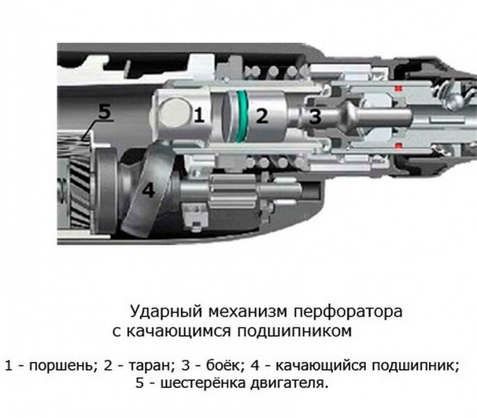 Перфоратор Существует два типа ударного механизма: Наибольшее распространение получил электропневматический вариант.Качающийся подшипник и поршень основа ударного механизма перфоратора. Вращаясь основной вал качающегося подшипника совершает поступательные движения, передавая усилие на таран пневматического цилиндра. Воздух в цилиндре толкает поршень с бойком. Рабочая часть патрона подвергается ударам бойка, зажатый в патрон бур бьет по рабочей поверхности.