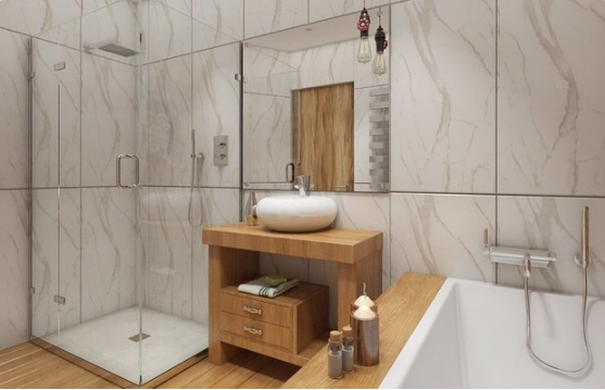 Они визуально сделают помещение просторнее. Ими рекомендуется отделывать стены и потолок. В качестве акцента можно добавить яркую либо темную плитку, мозаику.
