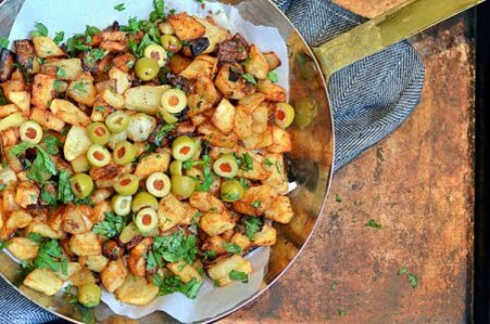 Шаги: 1. Картофель чистим, хорошо моем, режем дольками, выкладываем на разогретую сковороду с маслом. 2. Добавляем мелко порезанные оливки, сок лимона, солим, перчим. Хорошо перемешиваем. 3. Жарим до готовности картофеля, подаем к столу, посыпав зеленью. Ингредиенты: