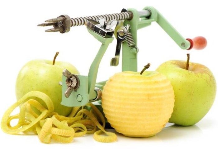Крепится данное изобретение по типу ручной мясорубки к краю стола. Срезающий кожуру нож подводится к яблоку, которое крепится на очень длинный винт и вращается при помощи ручки. Времени на манипуляции по сборке и очистку уходит гораздо больше, чем при использовании обычного ножа, а тем более овощечистки.