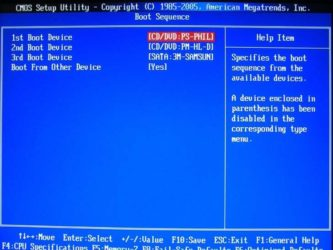 - Выставляем приоритетность загрузки системы с нужного нам загрузочного сектора компакт диска или USB накопителя, а не с HDD. Как это происходит? Стрелками на клавиатуре добираемся до пункта “Boot Device Priority”. Функционалом F5, F4 выбираем значение CD-ROM или флешку на самую главную первую позицию.