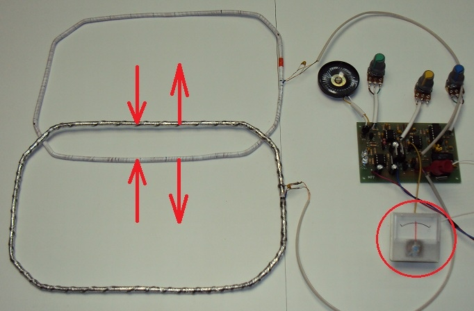 Если приемный тракт на участке U1A, U3, U1B исправен, то при настройке катушек RX и TX друг относительно друга показания прибора, включенного между общим проводом и КТ1 будут переходить нулевую отметку, изменяя полярность, а при установке стрелки на ноль, при попадании в зону катушек крупного металлического предмета, стрелка будет отклоняться от нуля. Работу ОУ U2A и U2B можно проверить по свечению встречно-параллельно включенных светодиодов HL1 и HL2.