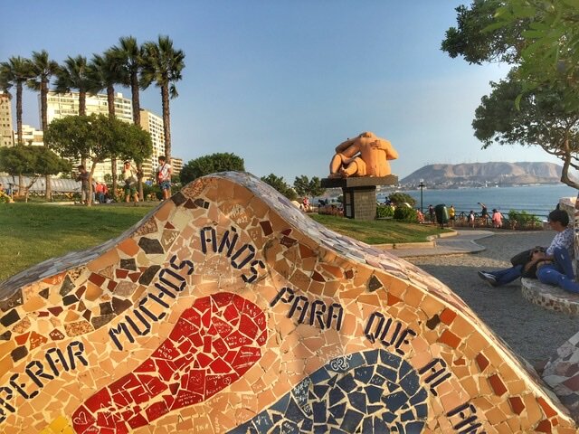 Одно из самых популярных мест в Лиме - парк Любви. Этот небольшой парк был открыт в день Святого Валентина, 14 февраля 1993 г. Этот парк полюбился не только туристам. Местные жители часто приходят сюда, чтобы полюбоваться на закат, а среди молодожёнов считается хорошей приметой заехать в этот парк после венчания. Влюблённые парочки любят сидеть на мозаичной ограде с цитатами на тему любви. Это фразы из произведений известных поэтов и писателей любовной тематики. И фотографироваться на фоне скульптуры целующихся влюблённых. Эта, чуть грубоватая, скульптура «Поцелуй», стала символом парка. Каждый год, 14 февраля рядом с этой скульптурой собираются влюблённые пары, чтобы участвовать в конкурсе на самый длинный поцелуй. На входе в парк можно увидеть стену, стилизованную под парижскую «стену любви». Правда, слов на русском я там не нашла.)