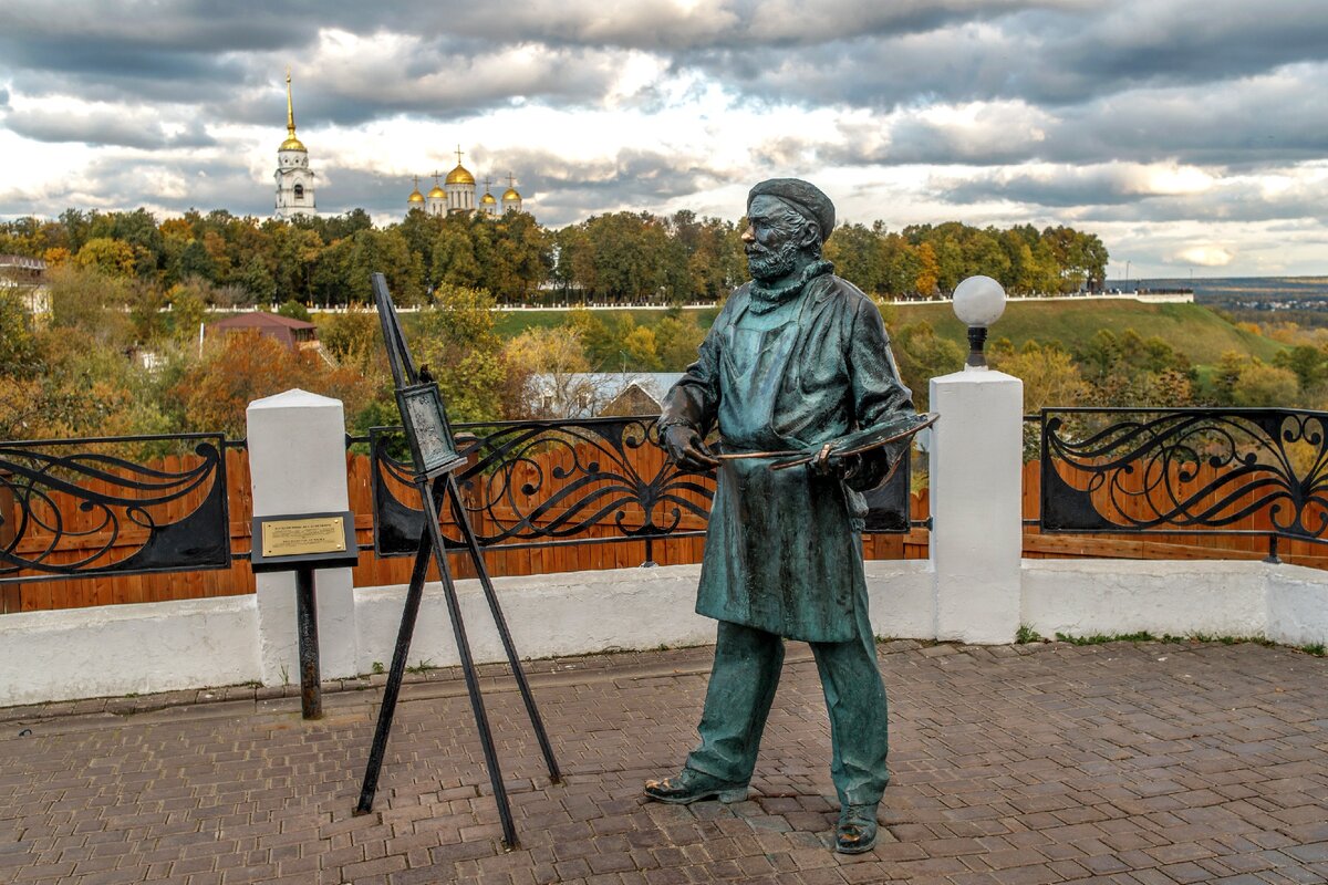 Здесь видим необычную скульптуру «Художника во Владимире». Памятник представляет собой бронзовую ростовую фигуру живописца, в руках у него палитра с красками, в кармане – кисти, а на голове традиционный берет. Перед художником стоит мольберт с незаконченной картиной, на которой явно угадывается силуэт Успенского собора и те потрясающие виды, которые открываются отсюда.