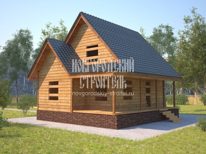 Внешние стены и перегородки сложены из профилированного бруса. Для несущих стен может быть использован брус с сечением 150х150 мм или 200х150 мм, для перегородок – 100х140 мм. Фронтоны здания выполнены по каркасной технологии, на базе бруса 150х150 мм с обшивкой имитацией бруса снаружи и вагонкой – внутри. Поскольку сруб возводится «под усадку», то есть подлежит отделке не ранее окончания срока естественной усушки и оседания пиломатериалов, дверные и оконные проемы в нем прорублены только частично, полы устроены черновые.