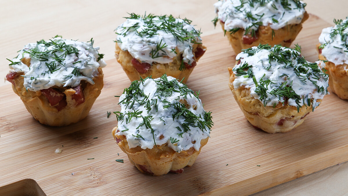 Закусочные кексы с колбасой и сметанно-творожным соусом