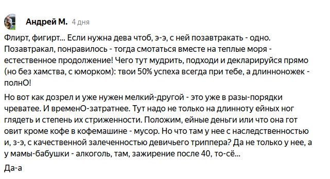 Прошлая моя статья наделала много шума. Что, ж, я не могу это проигнорировать и хочу продолжить эту тему :) Вот мнение одного из мужчин, прокомментировавших мою статью: Перевожу на более понятный язык. Здесь описан мужской принцип сразу обозначиться: И сразу все получают, что хотят. Мужчина — регулярный секс и любовь «длинноножки». А, дама - заботу, загар и новые фото в инстаграм. Как вам такой подход? Напишите свое мнение. Но тут мужчина пишет, что это хорошо для развлечения, а если же нужна жена, то тут требования подрастают… В ход идет все: генетика, родственники до 5го колена, кулинарные способности и так далее. Не хилые выводы напрашиваются после таких заявлений. Мужчины то подходят с головой, все по полочкам - «длинноножкам» одно, будущим женам — другое. Надо нам, дамы, тоже вырабатывать свою систему, как вы считаете? После этого, неудивительно, что я часто слышу от девушек: «я боюсь флиртовать». А, некоторые вообще считают, что это непристойное поведение. И одни и вторые о