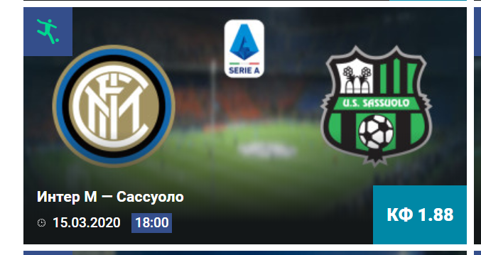В воскресенье, 15 марта, на стадионе Джузеппе Меацца Интер примет Сассуоло в 27 туре чемпионата Италии по футболу. Хозяева — одни из фаворитов Серии А, которые продолжают борьбу за золотые медали, а гости крепкие середняки национального первенства. Если хотите сделать ставку на Интер — Сассуоло в БК Winline, советуем изучить прогноз на матч на сайте Спорт Ставки. Читайте также: ПСЖ — Боруссия Дортмунд: прогноз и ставка на матч Интер У черно-синих были отменены уже два матча в национальном первенстве из-за эпидемии коронавируса в Италии. Последний раз в Серии А они играли на выезде с Лацио в середине февраля, уступив 1:2.
