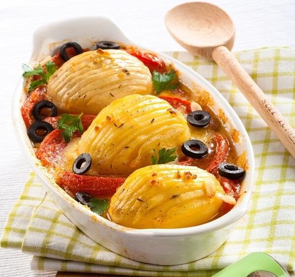 - Помидоры вымыть, обсушить, залить кипятком на 30 с, удалить кожицу, разрезать на 4 части. Картофель вымыть, очистить, с одной стороны сделать частые продольные надрезы. Семена тмина растолочь в ступке.