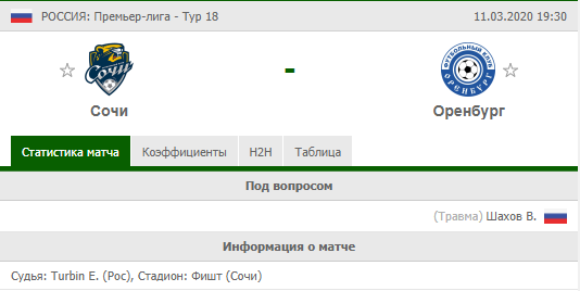 Доброго времени суток! Вы на канале Sport News, и я рад представить вам прогноз на матч 18 тура Российской Премьер Лиги. Сегодня 11 марта в 19:30 по московскому времени, на стадионе "Фишт" (Сочи) встретятся "Сочи" и "Оренбург", матч будет обслуживать судья Евгений Турбин. И специально для читателей моего канала я подготовил прогноз на матч. Перед тем, как озвучить прогноз предоставлю немного полезной информации и фактов о командах. Из имеющихся фактов и данных, я могу предположить, что здесь выиграет "Сочи". Они на порядок сильнее своих оппонентов и борются за выход из зоны вылета, ну и стоит учесть, что спонсоры могут дать отмашку "Оренбургу" помочь с очками "южанам". Специально для тех, кто хочет поиграть с эмоциями и поставить на "Сочи", я подготовил список коэффициентов, которые дают легальные на территории РФ букмекеры: Ну а на этом все дорогие друзья! Надеюсь мой прогноз вам понравился, поэтому ставьте лайки и пишите свое мнение о том, кто выиграет этот матч