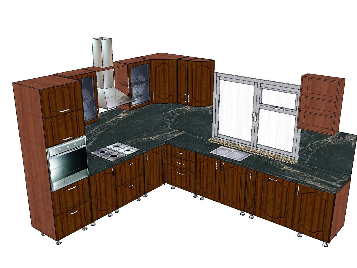 В данной статье мы хотим вам рассказать о нашем успешно выполненном проекте для заказчиков из р.п. Нахабино Московской области. Данную кухню мы проектировали и изготавливали в ноябре 2018 года. Заказчики обратились к нам по рекомендации своих знакомых, которым мы ранее делали кухню. Для дома из сруба семье требовалась кухня из натурального дерева. В результате обсуждения и составления дизайн-проекта родилась угловая кухня с фартуком и мойкой в комплекте. На месте был составлен вот такой 3D-проект: Была определена цена кухни в 339800 рублей за комплект, включая столешницу, стеновую панель со всеми соединительными элементами, витражи, карниз, балюстрады, все петли Blum с доводчиком, механизмы Blum Tandembox с доводчиками (см.видео в конце этой статьи), посудосушитель на 600 в нижнюю базу с доводчиком, "Волшебный уголок" с доводчиком, ручки с керамическими вставками, плинтус и цоколь пластиковый Rehau. Мойка из искусственного камня также входила в комплект. В результате вся комплекта
