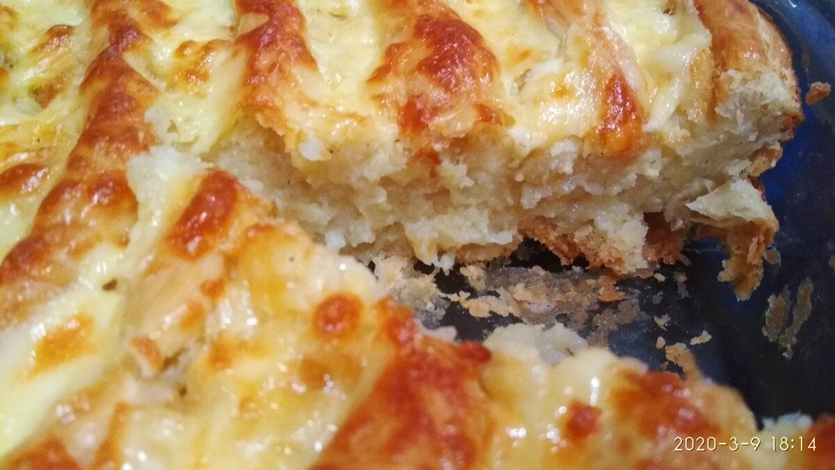 Картофельная запеканка для тех, кто вообще не умеет готовить. Ну или когда не хочется заморачиваться, а ребенок просит пирожков с картошкой. 2 листа слоеного теста 5 картофелин 1 луковица сливочное масло + подсолнечное масло для жарки 1 яйцо сыр 50гр. Соль, перец по вкусу. Картоху варим. Делаем пюре. Пусть остывает. Луковицу мелко режем и жарим на смеси масел сливочного и растительного. Добавляем в пюрешку нашу. Перемешиваем всё. На этом этапе мне уже захотелось съесть начинку для пирога. Но решила продолжить. Форму для запекания смазываем растительным маслом. Одним пластом теста залепляем форму (изнутри). Кладём начинку, ровненько только. Второй пласт режем на "ленточки" и укладываем сверху на начинку, делая, как бы узор какой-нибудь. А можно просто раскатать и сверху положить. Но обязательно наковырять в верхнем слое теста дырочки. Смазываем яйцом всю поверхность пирога и ставим в духовку, которая уже нагрелась на 180 градусах по Цельсию. Ждём минут 40. Сыр трём на терке. И посып