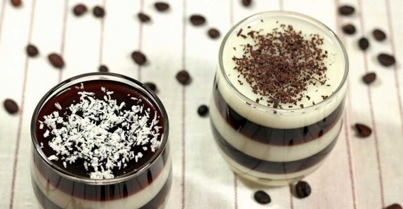 4. Для кофейного желе сварить сладкий кофе, смешать его с оставшимся желатином, прогреть, замет охладить.